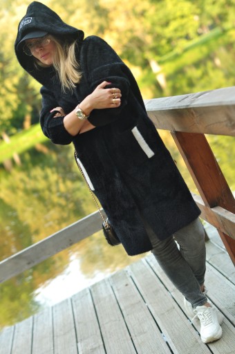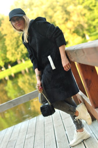Niezwykły PÓŁDŁUGI PŁASZCZ Z KAPTUREM z alpaki w kolorze czarnym.