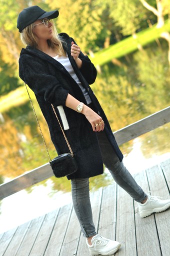 Płaszcz posiada po bokach dwie głębokie kieszenie.