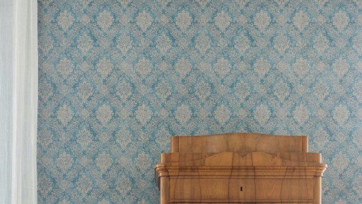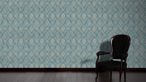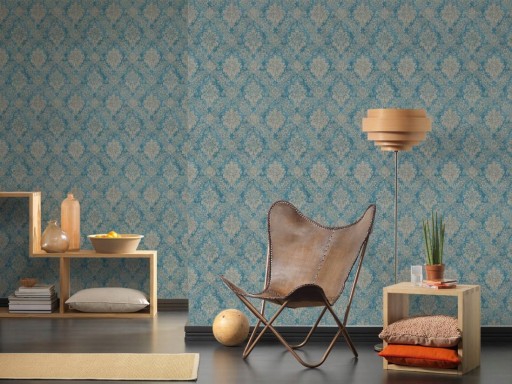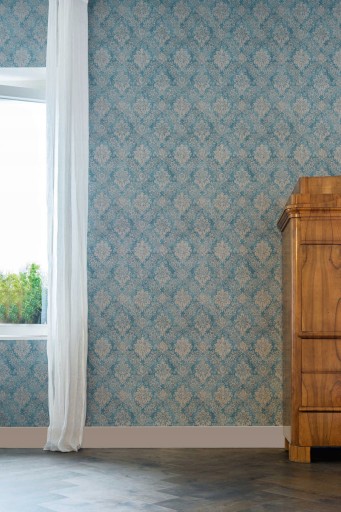 - Opis wzoru: tapety z turkusowym tłem i ornamentem w kolorze taupe.