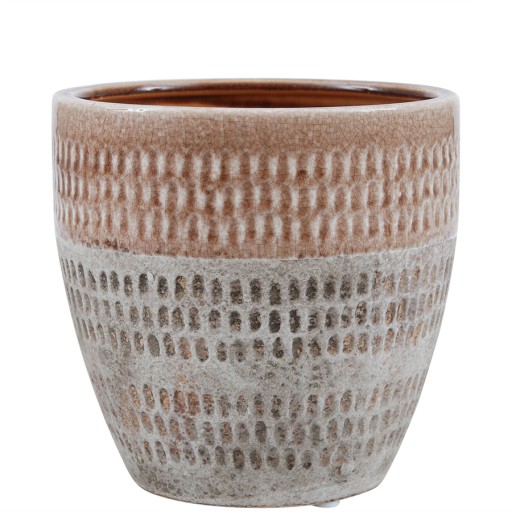 Doniczka ceramiczna w kolorze beżowym i brązowym. Szczególnie pięknie komponuje się z wiosennymi, zielonymi roślinami. Ta niezwykle oryginalna i elegancka osłonka wprowadzi wiele uroku do każdego wnętrza lub ogrodu. Zestawienie kilku różnych modeli w podobnej kolorystyce da ciekawy efekt dekoracyjny. Nie posiada otworu do odpływu wody.