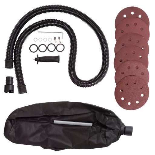 w zestawie urządzenie posiada worek zbierający pył oraz wąż, który możemy podpiąć bezpośrednio do odkurzacza