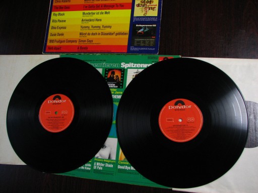 Dwa dość ciekawe albumy winylowe z muzyką do tańca. Są to skoczne hity z lat 67-68 w różnych językach z przewagą niemieckiego. Melodie wszystkim doskonale znane zarówno szybkie i skoczne jak i przytulanki. Świetna propozycja na prywatkę w stylu retro. Wydawnictwo Polydor nr 237319 i 237320 . Płyty i okładki są w nienagannym stanie.