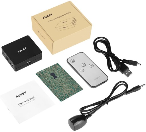 - Zawartość opakowania: 3-wejściowy przełącznik audio Toslink AUKEY HA-H11, kabel Mini-B, pilot, odbiornik podczerwieni,