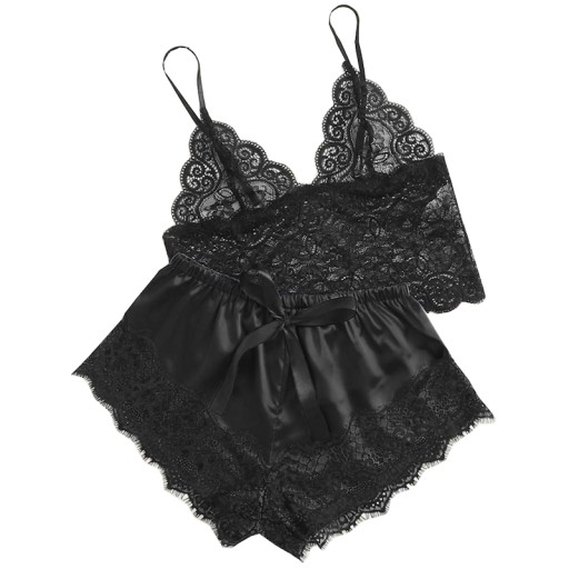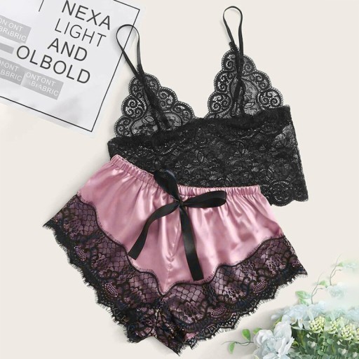 - Składa się z koronkowej koszulki i satynowych spodenek