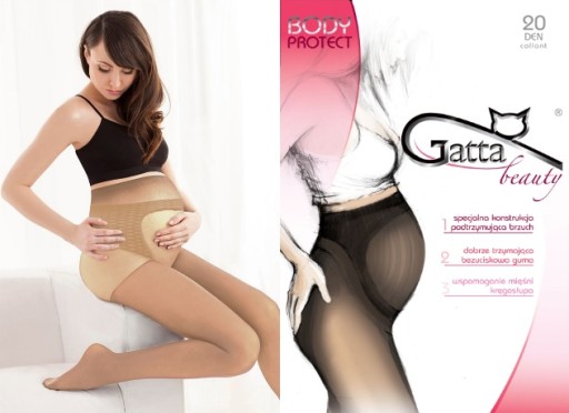 Rajstopy Gatta Body Protect - przeznaczone dla kobiet w ciąży. Posiadają specjalną budowę części majteczkowej - podtrzymując tym samym rosnący brzuch. Rajstopy wykonane zostały z wyjątkowo elastycznej i miękkiej przędzy Lycra Soft Comfort. Nie powodując jednocześnie ucisku.