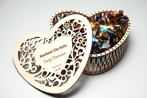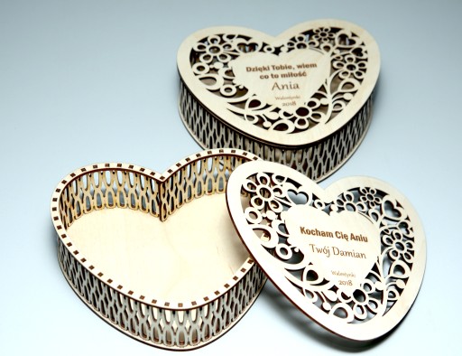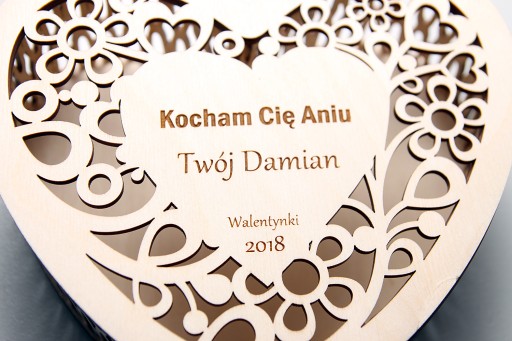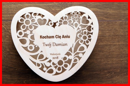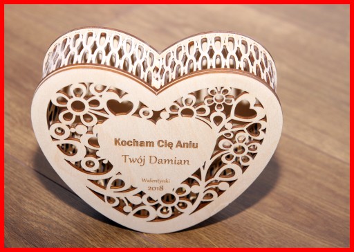 PIĘKNE DREWNIANE PUDEŁECZKO W KSZTAŁCIE SERCA Z TWOIM TEKSTEM, ŻYCZENIAMI, IMIENIEM.