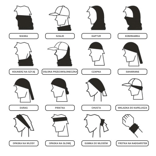 Poniżej prezentujemy tylko kilka z możliwych zastosowań dla naszego komina. Kup i przekonaj się sam, że to nie koniec możliwości jakie oferuje ta chusta!