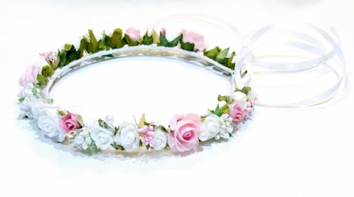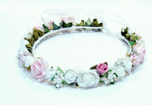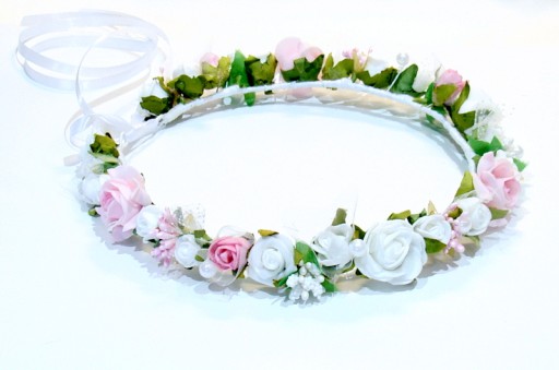 Wianek spleciony z białych i różowych różyczek piankowych, ozdobiony białymi i różowymi szyszeczkami. Dodatkowo zdobiony perłami.