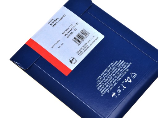 Opis towaru: Amatorski papier stałogradacyjny czeskiej firmy Foma. Produkowany w czterech gradacjach: miękkiej S, specjalnej Sp, normalnej N i kontrastowej C. Z gradacją miękką są ostatnio duże problemy u producenta... Oznaczony kolejno paskami koloru: zielonego, żółtego, czerwonego i niebieskiego. Powierzchnia: półmat 313, mat 312, błysk 311. Gradacje papieru są lekko zawyżone jeśli by je porównać do polskich papierów Fotonbrom. Obrabia się je w każdym wywoływaczu, przerywaczu czy utrwalaczu dostępnym na rynku. Podłoże plastikowe PE - nie wymaga długiego płukania oraz suszenia na gorąco. Odbitki należy płukać krótko i suszyć na wolnym powietrzu na leżąco lub w stanie wiszącym. Podłoże przy suszeniu musi przepuszczać powietrze np. materiał, tkanina, odbitki suszone na blacie stołu lub szkle nie wysuszą się od spodu ! Gradację papieru dostosowuje się do gradacji negatywu na zasadzie przeciwieństwa. Kontrastowy negatyw wymaga papieru miękkiego, negatyw miękki - papieru kontrastowego, a normalny - papieru normalnego. Sprzedajemy jedno opakowanie papieru: 25 arkuszy w formacie 10x15 cm. papier normalny, średni matowy - matny N 312.