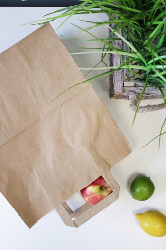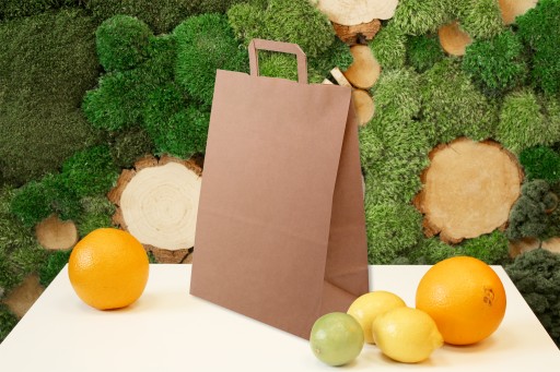 Torby papierowe z uchwytem płaskim wykonane są z brązowego papieru KRAFT, uchwyty toreb klejone wewnątrz toreb.