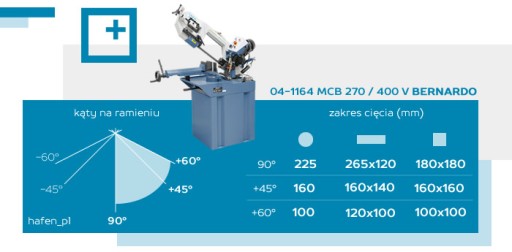 Przecinarka taśmowa MCB 270 ECO BERNARDO to ekonomiczny odpowiednik serii HBS 275 BERNARDO. Solidna piła do uniwersalnego zastosowania w bardzo korzystnej cenie! Przecinarka taśmowa do cięcia pod kątem do 60° ze skrętnym ramieniem opuszczanym na siłowniku hydraulicznym oraz układem chłodzenia. Gabaryt cięcia aż do 225 mm (płasko 265x120 mm).