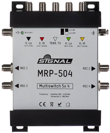 Multiswitch Signal MRP-504 to urządzenie, które umożliwia połączenie sygnału telewizji satelitarnej i naziemnej i transmisji zsumowanego sygnału do 4 punktów (gniazd końcowych). Multiswitch posiada możliwość zasilania wzmacniaczy anten telewizji naziemnej. Urządzanie zostało wyposażone w przełącznik, który umożliwia włączenia lub wyłączenie zasilania 12V.