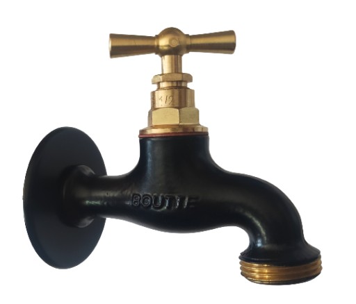 Kran ogrodowy, zawór czerpalny 1/2" kolor czarny mat RAL9005 z rozetą w zestawie, gratis przyłącze na kran z gwintem wewnętrznym 3/4"
