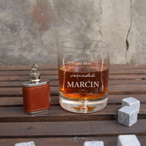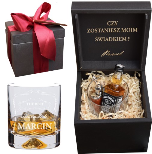 Czarne, klasyczne pudełko i szklanka na whisky, a co najważniejsze personalizacja czyli podarek, który pozostanie pamiątką na wiele lat i będzie unikalnym zaproszeniem dla świadka.