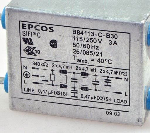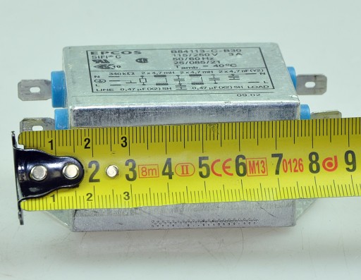 Używany, całkowicie sprawny filtr przeciwzakłóceniowy EMC o symbolu: B84113-C-B30 SiFi C firmy EPCOS. Prąd do 3A, napięcie do 250V.