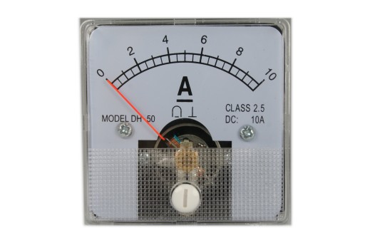 Miernik panelowy - amperomierz. Posiada wbudowany bocznik i śrubę służącą do regulacji zera(kalibracja).