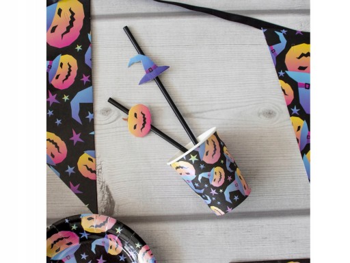 Papierowe kubeczki w czarnym kolorze z nadrukiem dyni, idealnie nadają się do dekoracji na Halloween.