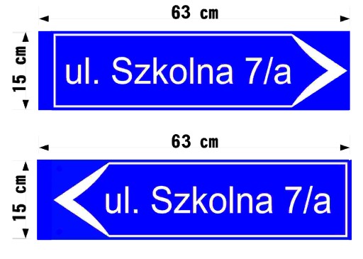 Oferowanym przedmiotem jest dwustronna pozioma tabliczka . Można na niej umieścić adres z numerem posesji, nazwę ulicy, miejscowości lub każdy dowolny napis ( nazwa firmy, logo). Jej wymiary to 63 cm x 15 cm.Tabliczka wykonana jest na solidnym materiale podkładowym jakim jest płyta kompozytowa o grubości 3 mm. Tabliczka posiada w zestawie dwa uchwyty montażowe umożliwiające montaż tabliczki do słupka , rury.Dostępne są uchwyty do słupków o średnicy 48 i 60 mm