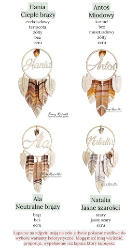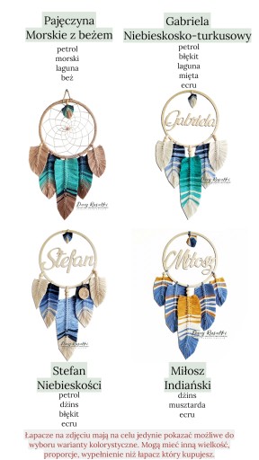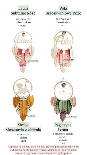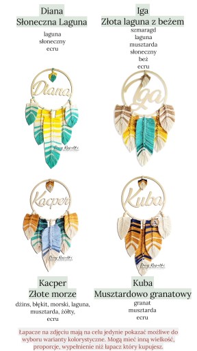 W mojej ofercie znajdziesz inne rozmiary łapaczy snów, różnorodne dekoracje na ścianę, biżuterię i zestawy prezentowe dla niemowląt. Większe zamówienia zawsze honoruję atrakcyjnymi gratisami :)