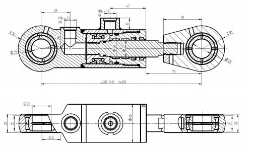 - Długość siłownika złożony 310 mm (mierzone w osiach łożysk)