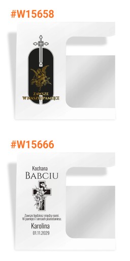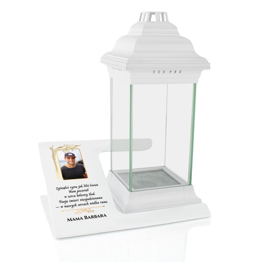 Podstawka na grób wykonana została z grubej (3 mm) pleksi, po lewej stronie zamieścimy wybraną przez Ciebie dedykację. Do każdej podstawki dołączamy lampion, maksymalna wysokość wkładu który zmieści się w lampionie to 16 cm.