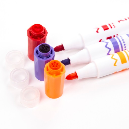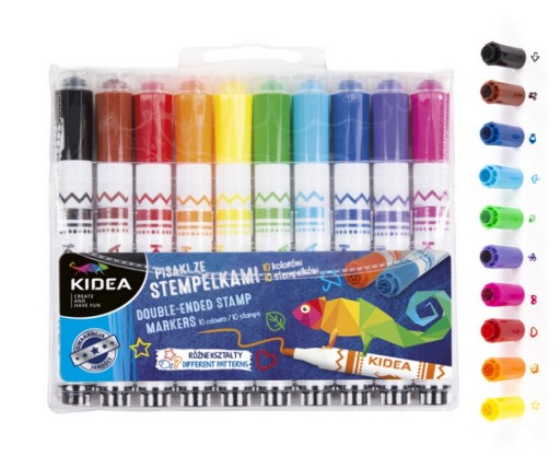Każdy pisak posiada końcówkę stemplującą w innym wzorze (gwiazdka, kwiatek, serduszko, kokardka, wisienki, listek, parasolka, rybka, nutka i strzałka) i kolorze (czarnym, brązowym, czerwonym, pomarańczowym, żółtym, zielonym, niebieskim, granatowym, fioletowym i różowym), dzięki czemu każda praca plastyczna osiągnie oryginalny i spektakularny efekt.