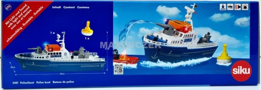 Pościg za przemytnikami na wodzie. Sprzed dziobu tryska piana. Łódź policyjna pędzi przez wodę z pełną mocą, biorąc kurs na szybką motorówkę. Policja ściga przemytników, włącza niebieskie i czerwone migające światła sygnalizacyjne LED oraz elektryczny sygnał dźwiękowy. Przemytnicy nie zatrzymują się, próbują uciec z wód terytorialnych. Jedyne, co pozostało policji, to zatrzymać łódź przemytników za pomocą armatki wodnej: woda naprzód marsz! W tym celu do armatki można wlać wodę i za pomocą korka wytworzyć ciśnienie. Łódź została trafiona armatką wodną, policjanci przyciągają ją na linie do łodzi policyjnej za pomocą wciągarki. Na rufie rozłożono klapę, a łódź jest wciągana na pokład. Zadanie wykonane: przemytnicy zostali schwytani. Nowa łódź policyjna SIKUWORLD może pływać i jest napędzana za pośrednictwem adaptera za pomocą standardowych silników innych zabawek systemowych. Jako akcesoria dostępna jest duża boja, używana wtedy, gdy łódź jest zacumowana.