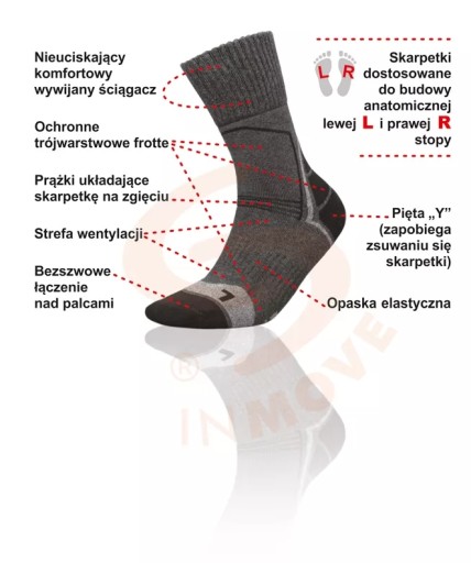 Skarpetki dostosowane do anatomicznego kształtu lewej (L) i prawej (R) stopy nie tylko przez odpowiednie wyprofilowanie frotte, ale i ukształtowanie innego konturu dzianiny wokół palców lewej i prawej stopy.