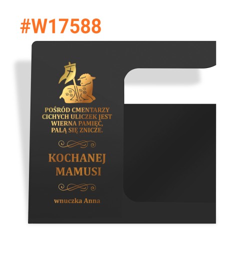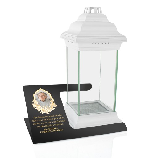Podstawka wykonana została z solidnego metalu w kolorze czarnym, dzięki czemu całość jest odpowiednio ciężka i stabilna, co chroni przed wiatrem. Metal został przycięty w taki sposób, że wszystkie boki zostały gładko wykończone, a jego powierzchnia została polakierowana proszkowo. Od spodu zostało zamontowane 5 specjalnych podkładek filcowych, które zabezpieczają pomnik przed zarysowaniem. Do każdej podstawki dołączamy lampion, maksymalna wysokość wkładu który zmieści się w lampionie to 16 cm.