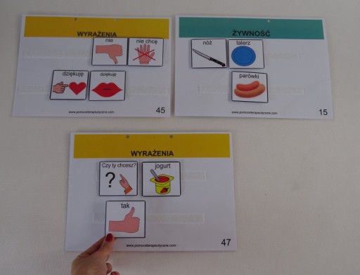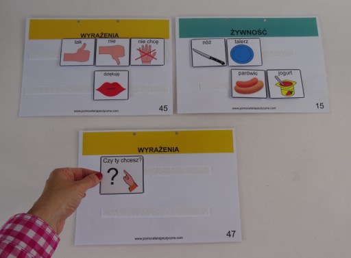 Możemy układać z dzieckiem różne zdania poprzez stosowanie piktogramów. Dziecko ma możliwość powiedzenia nam co w danym momencie chce robić, na co ma ochotę, czy powiedzieć jak się czuje. Posłuży nam do tego bogata seria różnorodnych obrazków.