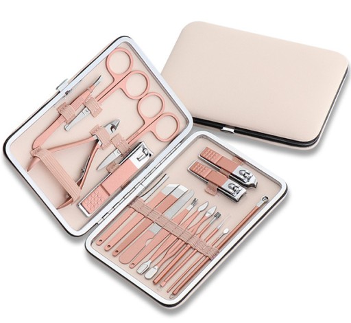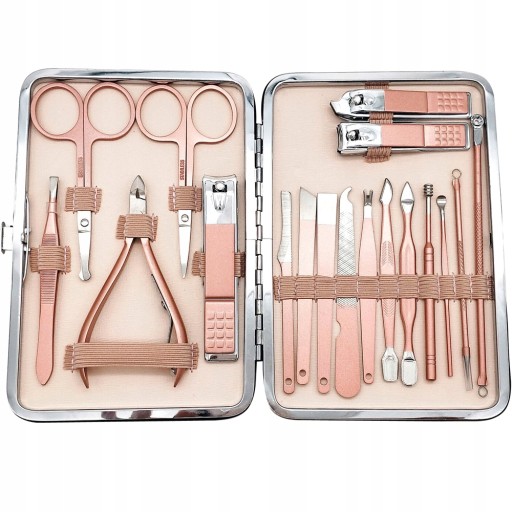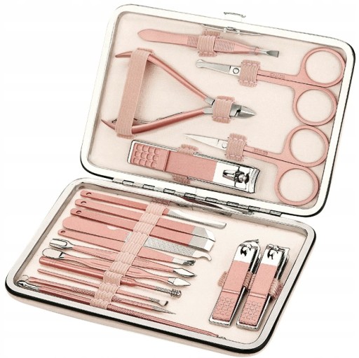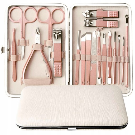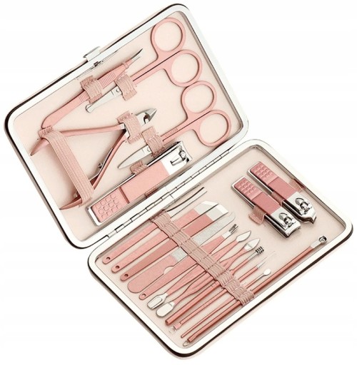 Piękny 18-elementowy zestaw do manicure w eleganckim etui. Przybory bardzo solidne i wytrzymałe naostrzone i gotowe do użytku.
