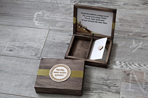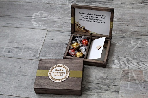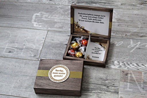 Drewniane pudełko z prośbą o zostanie Świadkiem.