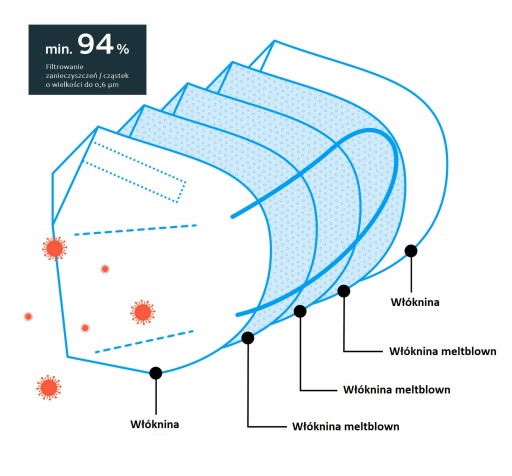 Dodatkowo do produkcji tej maski używamy trzech zamiast dwóch warstw włókniny meltblown.