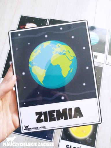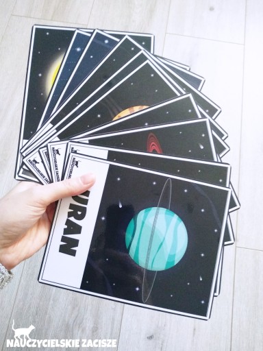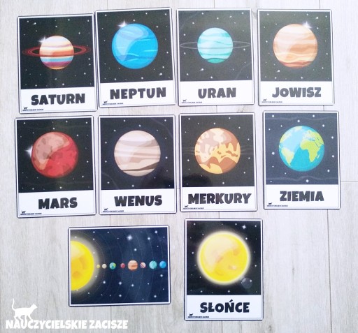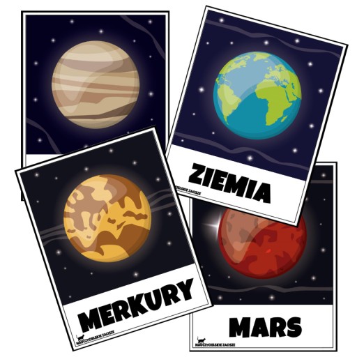 Na kartach znajdziesz: słońce, merkury, wenus, ziemia, mars, jowisz, uran, neptun, saturn, ukłąd słoneczny