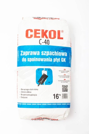 CEKOL C-40 jest suchą mieszanką wysokiej jakości gipsów, wypełniaczy i środków modyfikujących. Zawiera specjalne włókna celulozowe i poliamidowe. Przeznaczony jest do spoinowania płyt kartonowo-gipsowych i gipsowych. CEKOL C-40 jest nietoksyczny w użyciu i podczas eksploatacji. Jest produktem łatwym w użyciu, o bardzo dobrych parametrach użytkowych. Dzięki zastosowaniu szerokiej gamy dodatków CEKOL C-40 jest produktem o podwyższonej wytrzymałości i elastyczności, co pozwala na rezygnację z użycia taśmy. CEKOL C-40 należy stosować wyłącznie wewnątrz budynków. Szlifowany, po całkowitym wyschnięciu, odpowiednio dobranym papierem ściernym lub siatką z poliwęglanu, daje idealnie gładką powierzchnię.