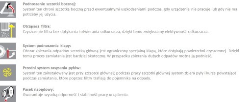 Istnieje możliwość pracy tylko z szczotką główną lub jeśli jest potrzeba zwiększenia szerokości roboczej i wymiatania z narożników wówczas opuszczamy szczotkę boczną.