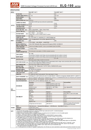 - Certyfikaty bezpieczeństwa: UL8750(type”HL”), UL879, CSA C22.2 No. 250.13-12; ENEC EN61347-1, EN61347-2-13 independent, EN62384; GB19510.1,GB19510.14; EAC TP TC 004;J61347-1(H29), J61347-2-13(H29),KC61347-1,KC61347-2-13,IS15885(Part2/Sec13)(for XLG-100I type only); IP67 approved