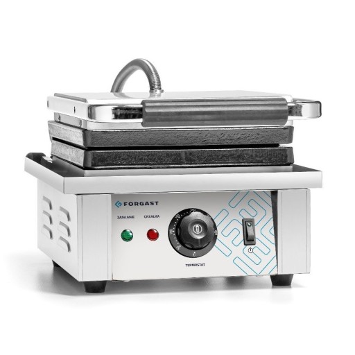 Gofrownica elektryczna marki Forgast z prostokątną formą na 2 duże gofry o wymiarach 10x17 cm. Wytrzymała obudowa ze stali nierdzewnej. Żeliwne płyty grzewcze pokryte teflonem. Gofrownica wyposażona w termostat. Regulacja temperatury w zakresie od 50 do 300oC. Kontrolki zasilania i grzania.