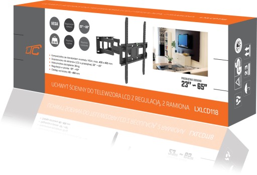 Uchwyt posiada dwa rozkładane ramiona, dzięki czemu możliwa jest regulacja odległości telewizora od ściany, a dodatkowo, uchwyt umożliwia regulację położenia urządzenia w trzech płaszczyznach.