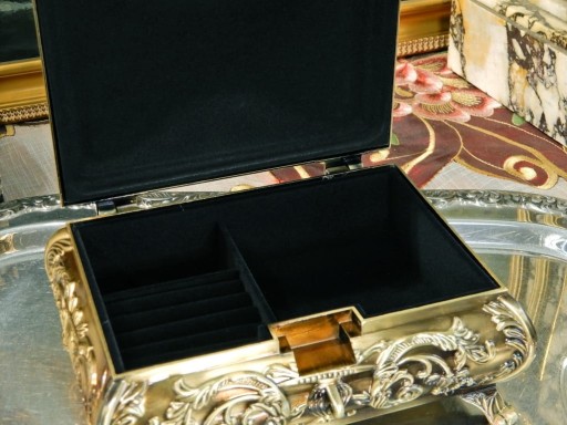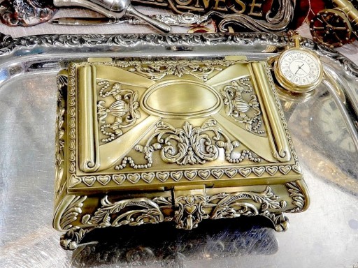 Zapraszam do zakupu efektownej, dość dużej szkatułki Jest wykonana ze stopu cynku, pokryta (platerowana) mosiądzem, uzyskano efekt starego złota.