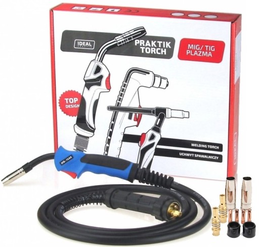 Profesjonalny uchwyt spawalniczy do urządzeń MIG. Prąd spawania dla cyklu pracy 60%: 180A (gaz CO2), 150A (mieszanka Ar/CO2). Długość 5 metrów.