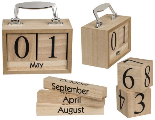 W drewnianej podstawce znajdują się dwie kostki z cyframi, dzięki którym ustawiamy odpowiedni dzień oraz tabliczki z angielskimi nazwami miesięcy.