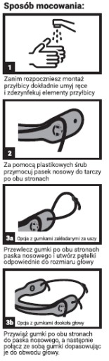 - Wygodne i szybkie zakładanie, dzięki paskowi nosowemu oraz dwóm gumkom zakładanym za uszy lub dookoła głowy gwarantującym idealne dopasowanie.