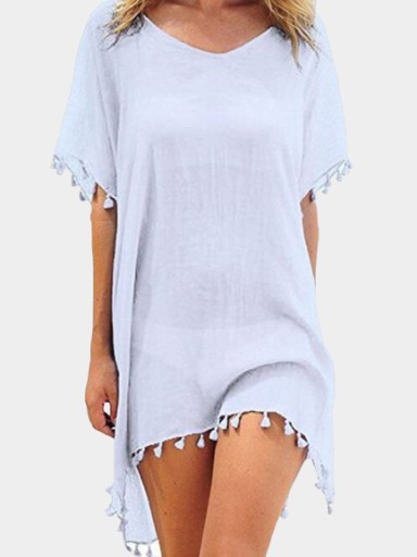 Lekkie plażowe pareo dostępne w kilku kolorach. Tunika wykończona została modnymi frędzlami w stylu boho, krój oversize zapewnia dopasowanie do każdej sylwetki oraz ukrywa ewentualne mankamenty sylwetki podkreślając przy tym wakacyjną opaleniznę.