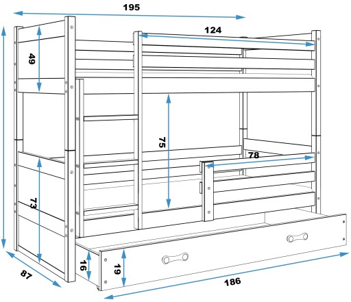 - Rama łóżka z drewna sosnowego pomalowana lakierem wodnym. Kolor ramy grafit , wypełnienia i szuflada kolor biały.