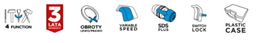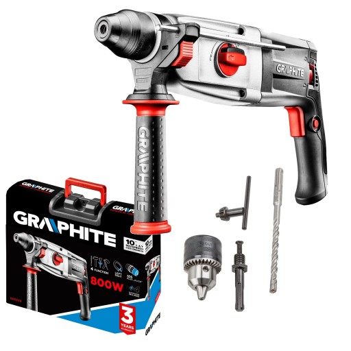 Nowoczesna młotowiertarka SDS+ GRAPHITE o mocy 800W, posiada m. in. funkcje wiercenia, wiercenia z udarem pneumatycznym. Duża moc pozwala młotowiertarce na wiercenie otworów do 28 mm średnicy w betonie i cegle, 13 mm w stali oraz 30 mm w drewnie. Młotowiertarka posiada możliwość zmiany kierunku obrotu wrzeciona, możliwość stopniowej regulacji prędkości oraz funkcję blokady włącznika do ciągłej pracy. Podczas wiercenia urządzenie może osiągnąć do 1200 obrotów w ciągu minuty, po przełączeniu na udar do 5300 uderzeń na minutę. Funkcja udaru uruchamia się w trakcie docisku wiertła do powierzchni wierconej.Energia udaru wynosi 3.2 J. Młotowiertarka posiada funkcję "click" do szybkiego mocowania wiertła. Rękojeść główna narzędzia pokryta jest antypoślizgową nakładką, dzięki czemu pewnie leży w dłoni.Urządzenie wyposażono w elastyczny i wytrzymały przewód zasilający w powłoce gumowej o długości 3m