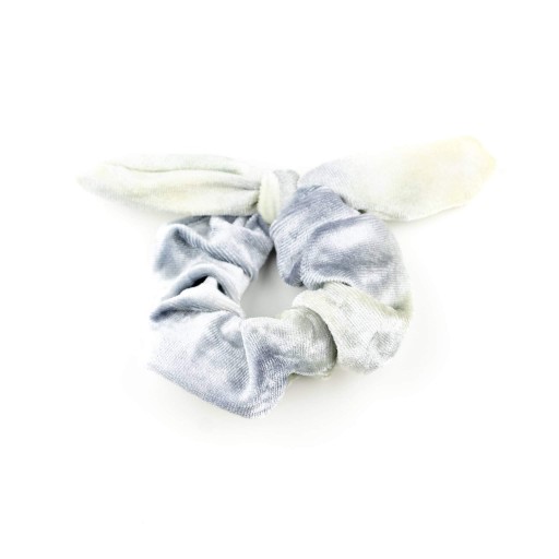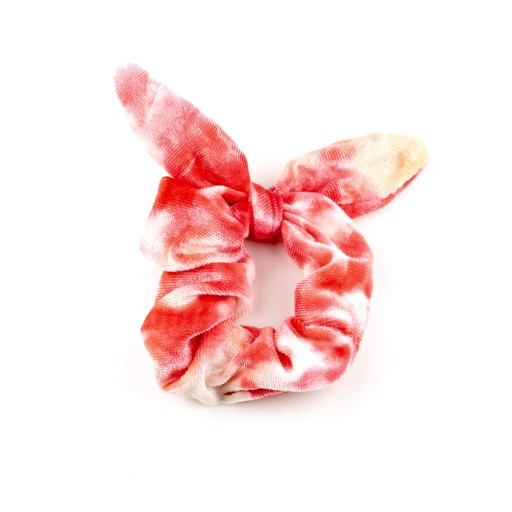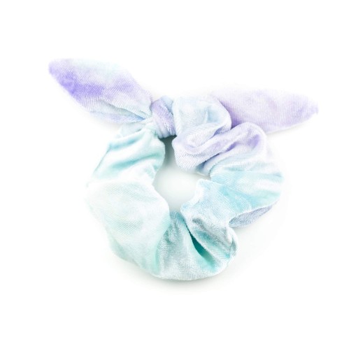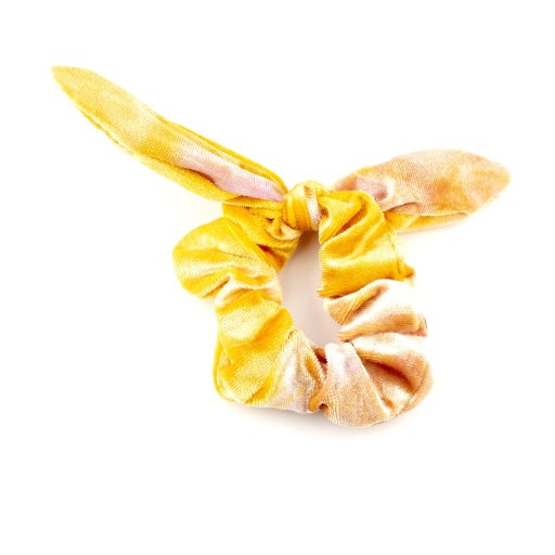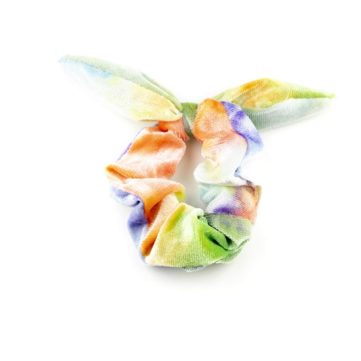 Zestaw fikuśnych i oryginalnych, tęczowych scrunchies z uszami królika.