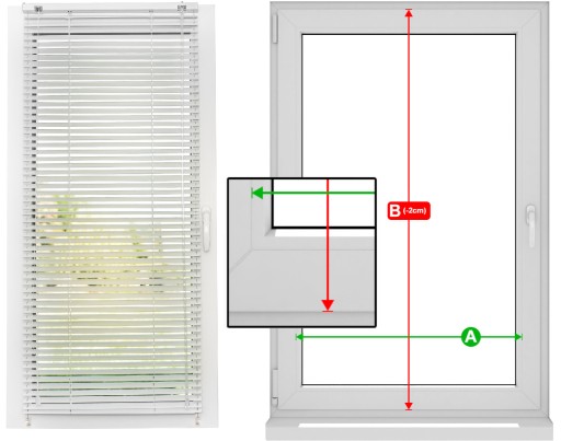 Wysokość żaluzji B to- wysokość całkowita skrzydła okna minus 2 cm