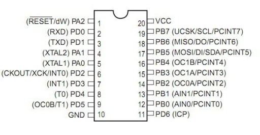 Mikrokontroler z rodziny Atmel AVR w 20-nóżkowej obudowie przewlekanej - DIP. Zasilany napięciem z zakresu od 1,8 V do 5,5 V, taktowany sygnałem do 20 MHz, posiada 2 kB Flash, 128 B RAM, 128 B EEPROM.