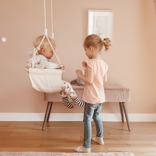 MAMOI® Huśtawka dla dzieci do domu i ogrodu w stylu skandynawskim z poduszkami i koralami w kolorze - BEŻOWYM ORAZ PASEM W ODCIENIU BEŻU.